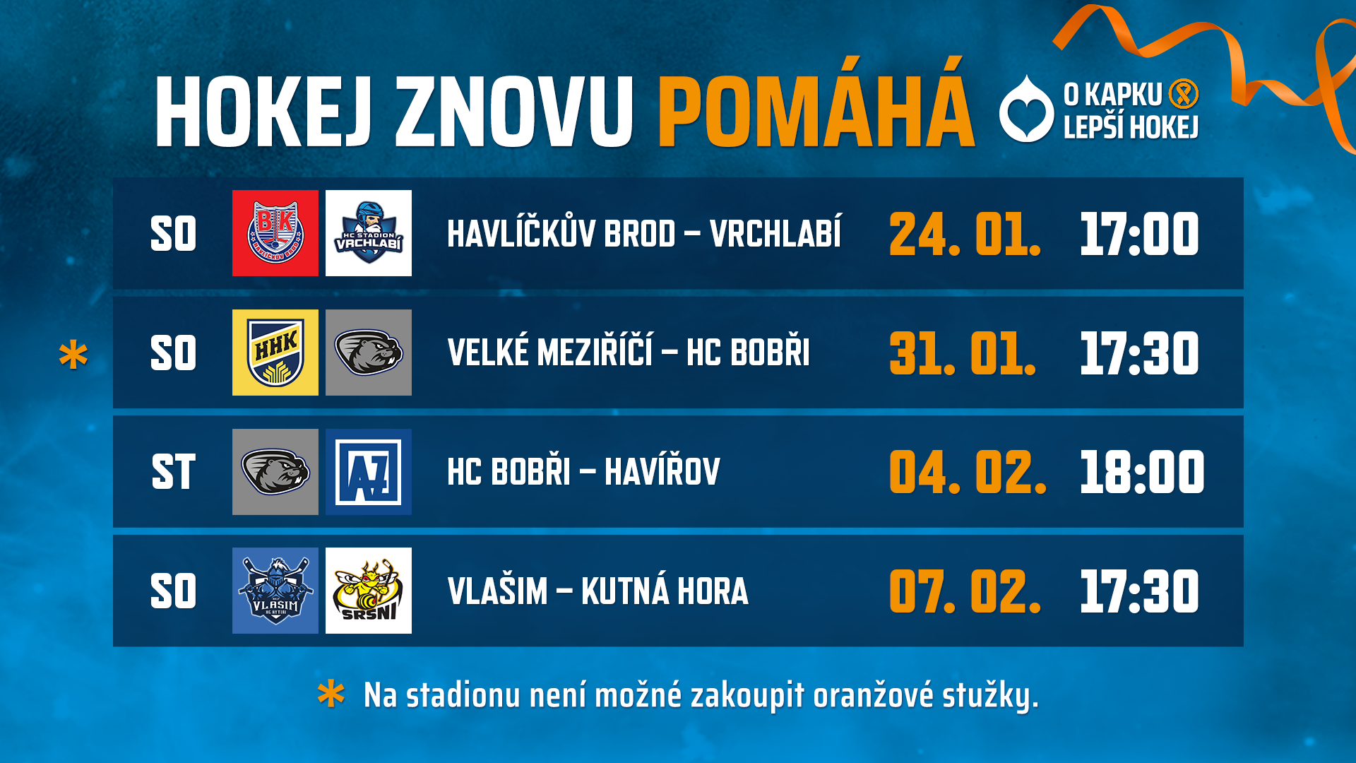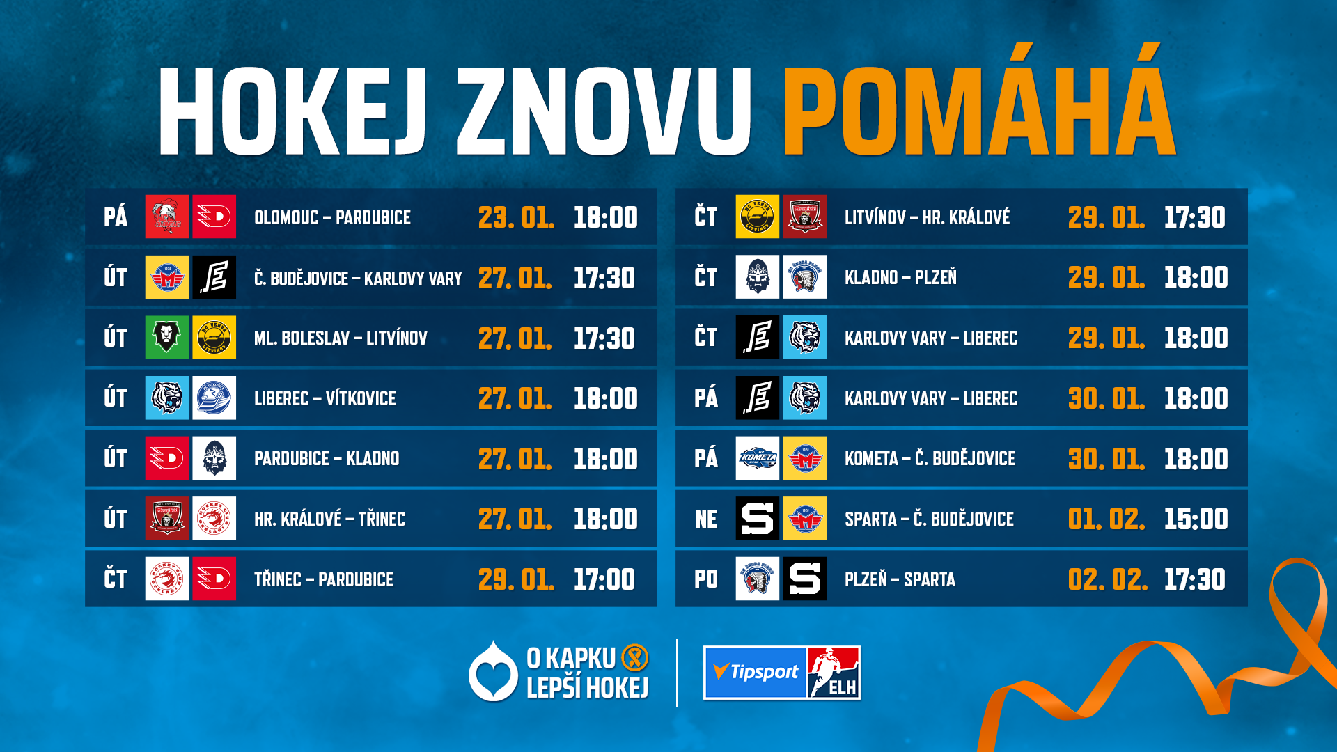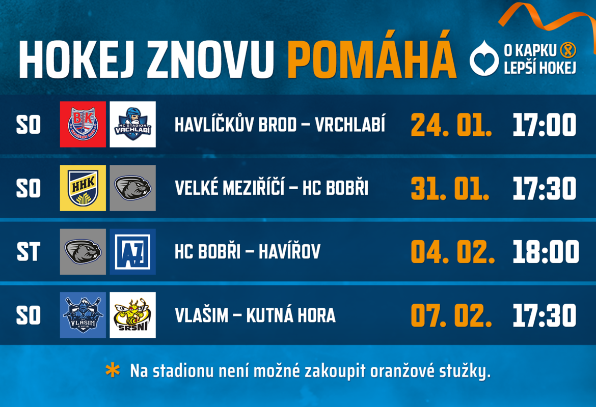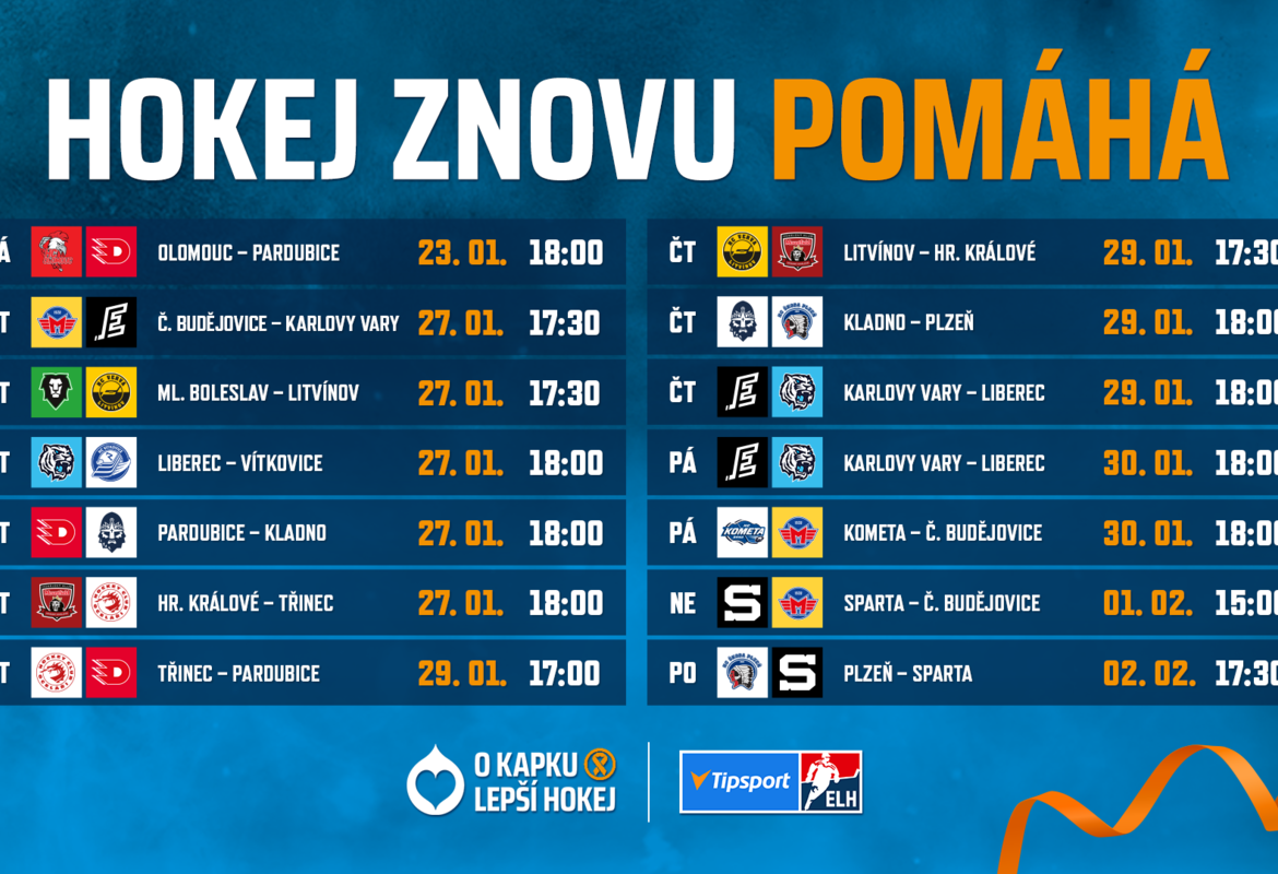 Vše o projektu a možnostech pomoci najdete na webu www.okapkulepsihokej.cz. Na stadionech se bude hrát O Kapku lepší hokej při vybraných utkáních mezi termíny 23. ledna a 4. února 2026. Jejich přesný seznam najdete níže.